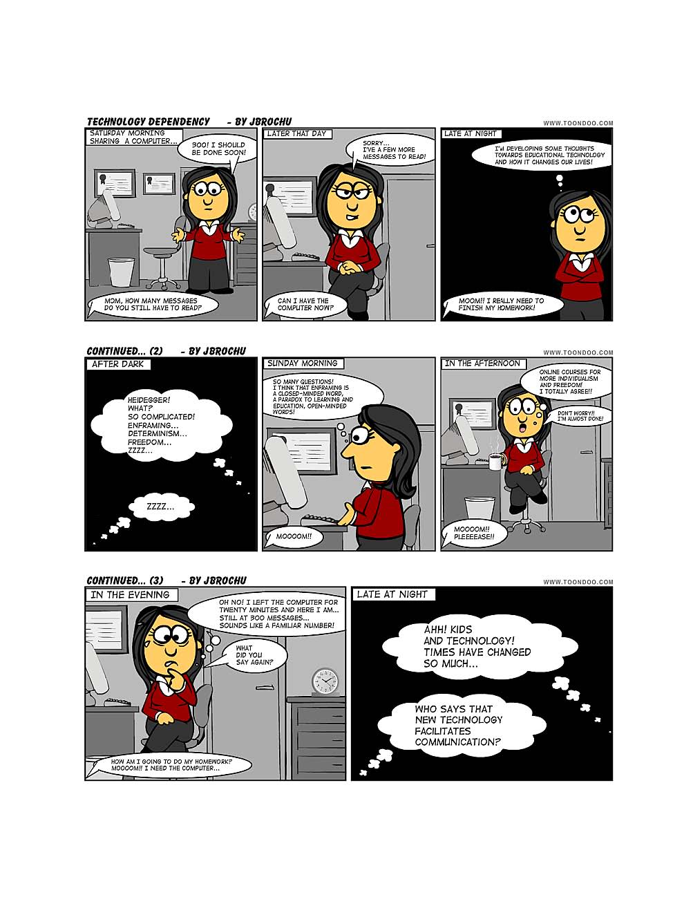 In ETEC 511, we formed a cohort of two groups — over 45 very engaged MET students who provided 7,202 discussion threads during the semester. In addition, at the time I took this course, I started a new job as a full time online teacher. Hence, I spent much of my day online, from early morning to very late at night. It was challenging to catch up with the discussion forum’s numerous threads and the course material readings; trying to perform in both was quite overwhelming. Moreover, I also had to take care of my own students’ discussion forums in five different courses (over 70 students). Indeed, this context has inspired me to create this cartoon for educational technology I called Technology Dependency (see below).