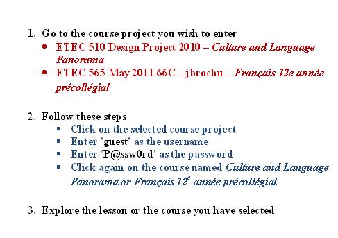 In ETEC 510, three colleagues and I developed three units of a language course; the three units were each done in a different language.  The theme was travelling in a new country and the course was for beginner professionals who need to learn the language quickly. Interestingly, our group was composed of two English-speaking people, one Spanish-speaking person and one French-speaking person (me); we were located in different parts of the world, Canada, Japan and Australia.  From this project, I gained a lot of knowledge and skills at using Moodle, which prepared me for a similar project in ETEC 565.